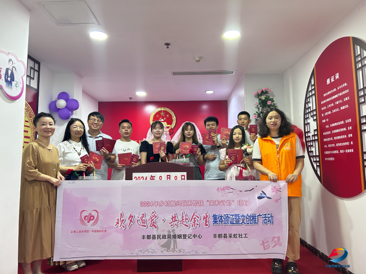 8月8日,县民政局婚姻登记中心联合县采虹社工开展了“欢‘夕’遇爱·共赴余生”集体颁证暨文创推广活动,共为22对新人开展颁证服务,发放《小欢喜》手册58本。